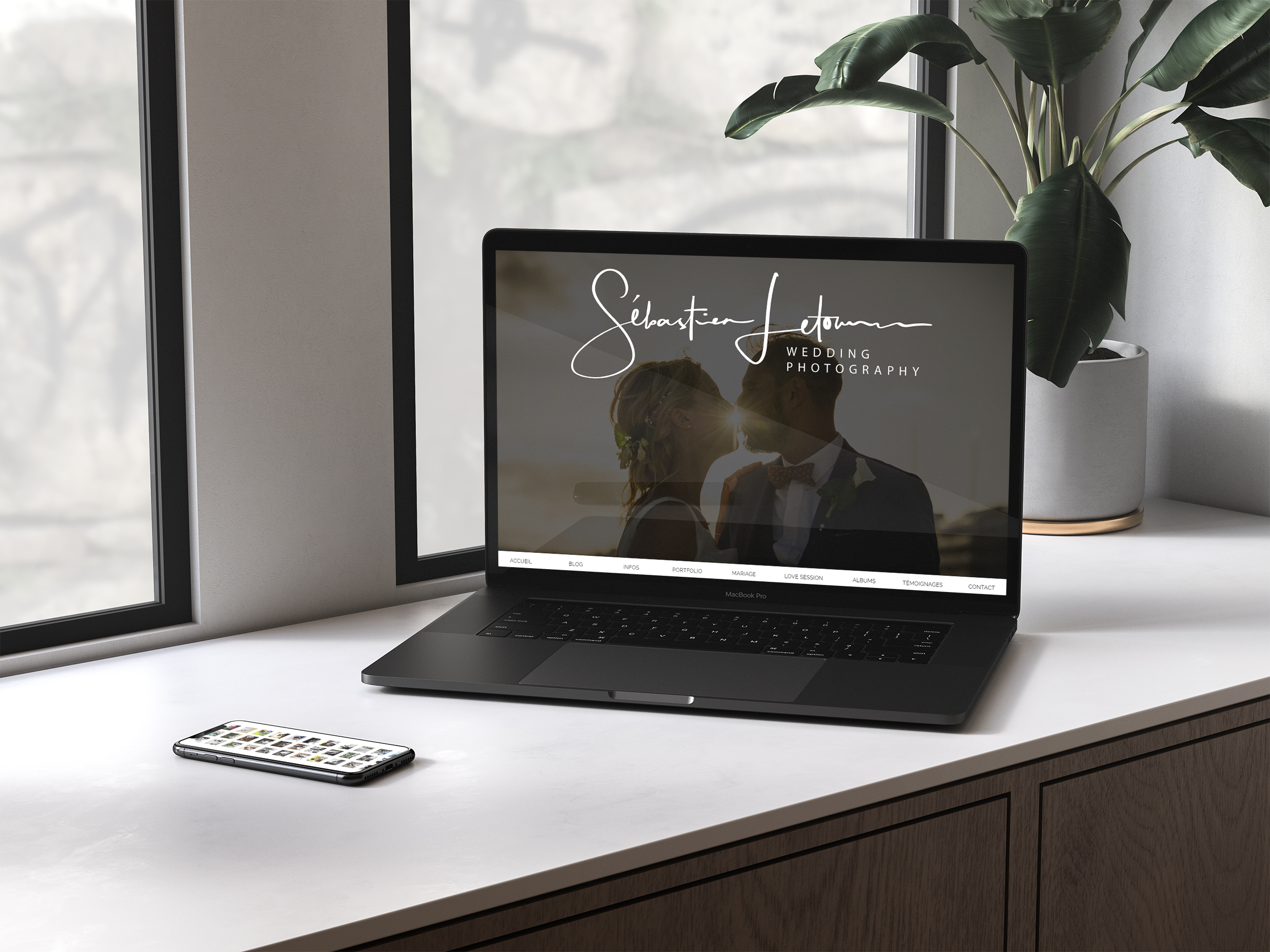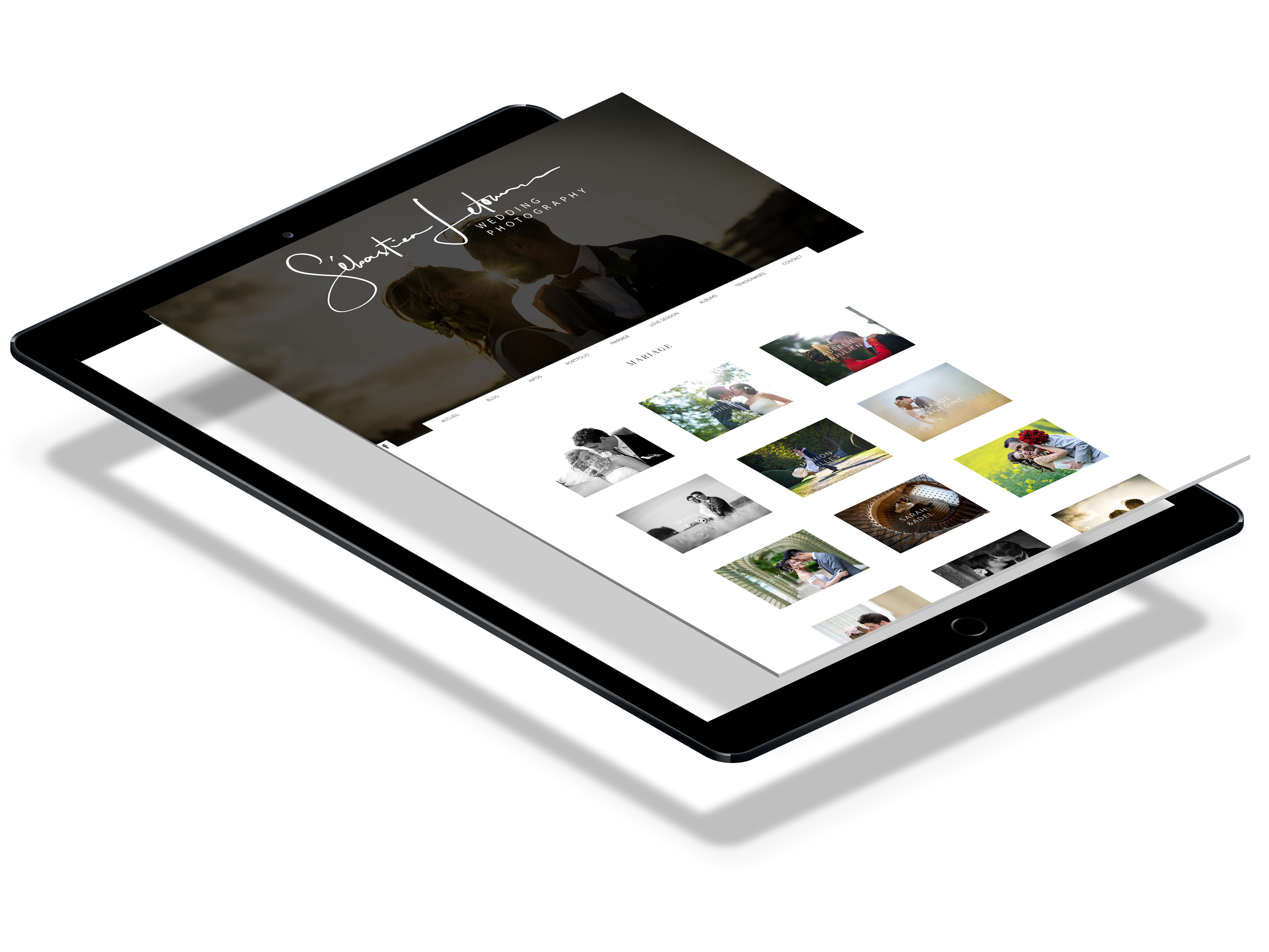 Refont from scratch d'un site web responsive pour un photographe de mariage. Créations vectorielles, impressions de cartes de visite et contrats.