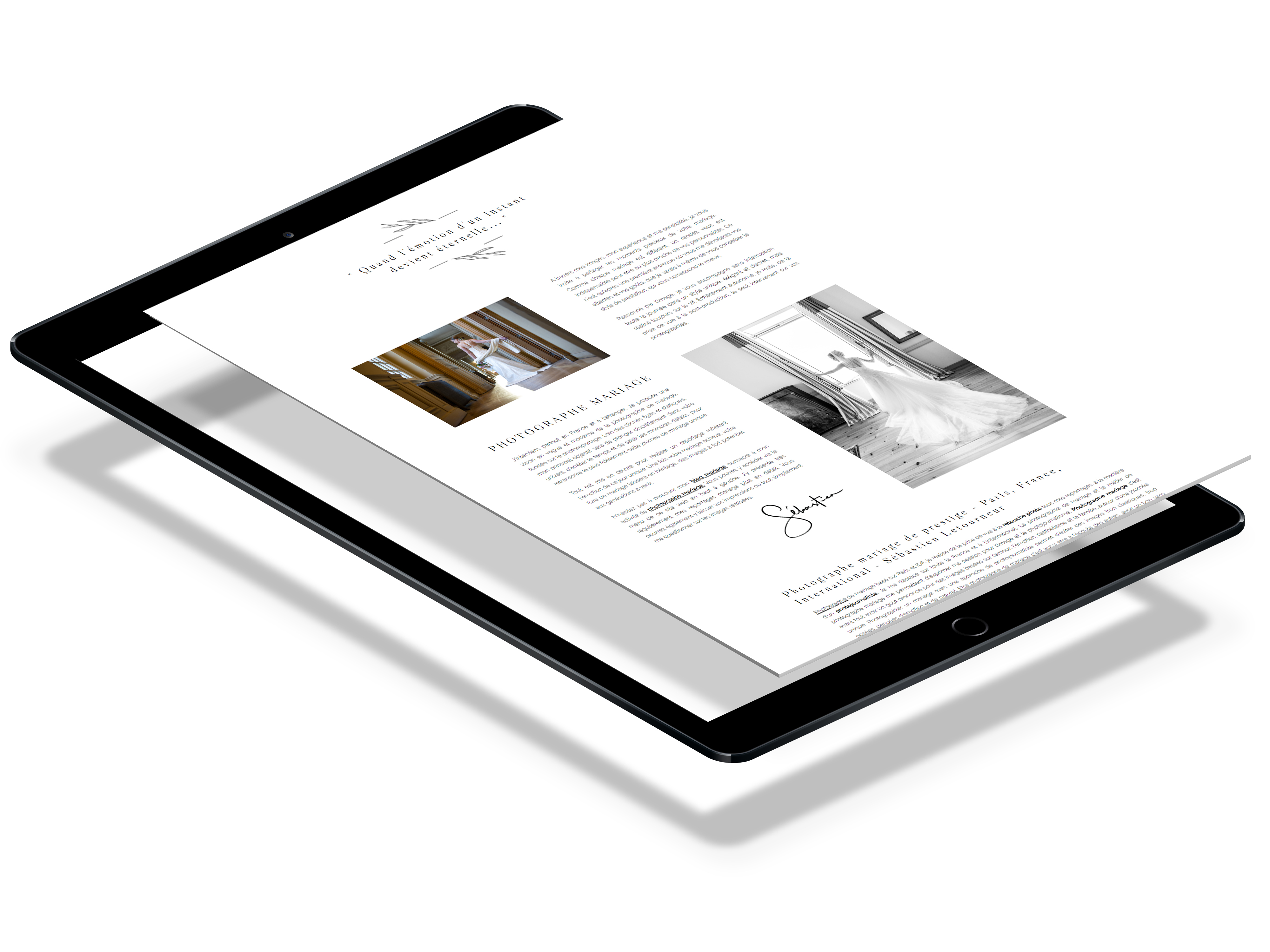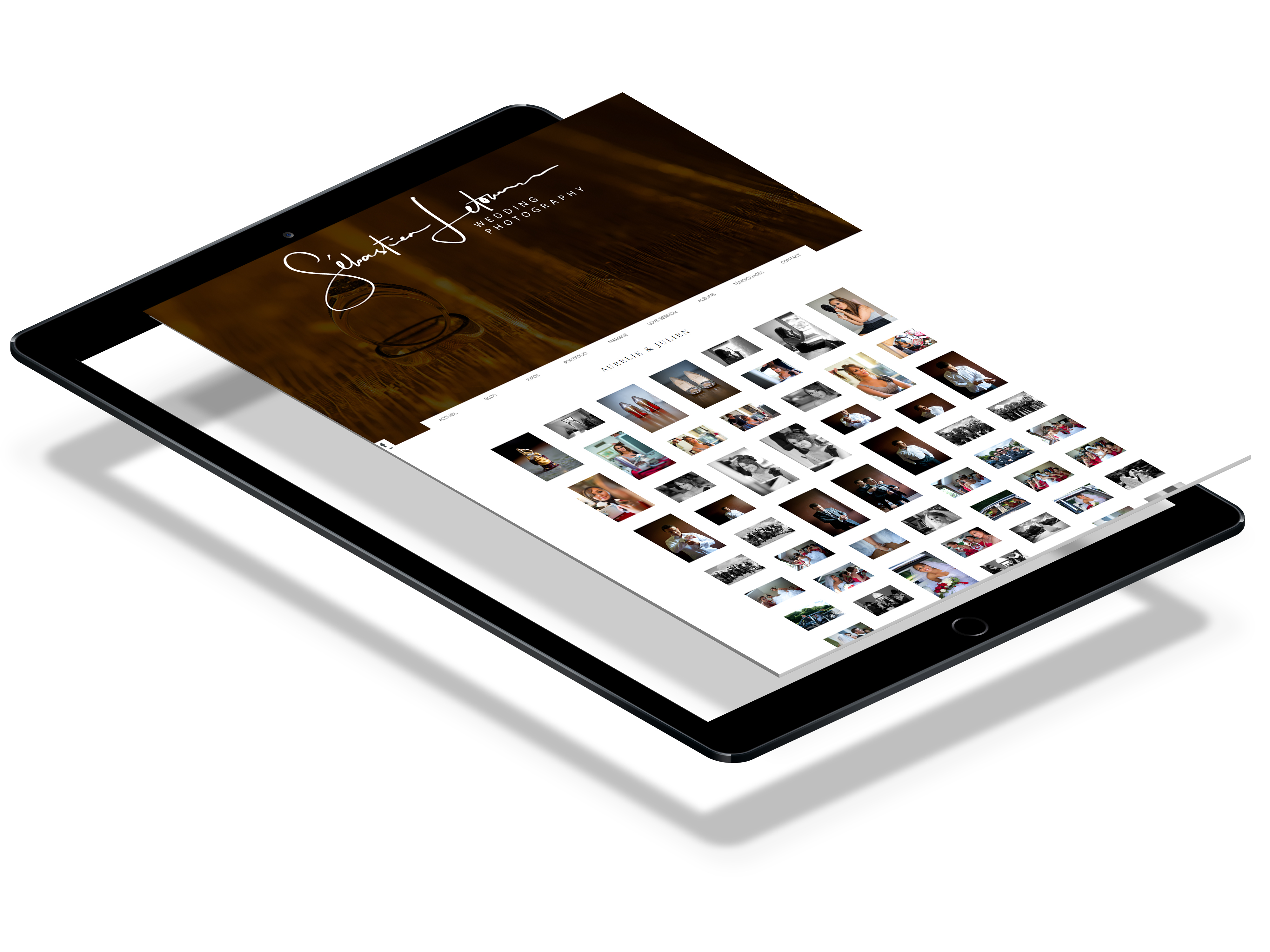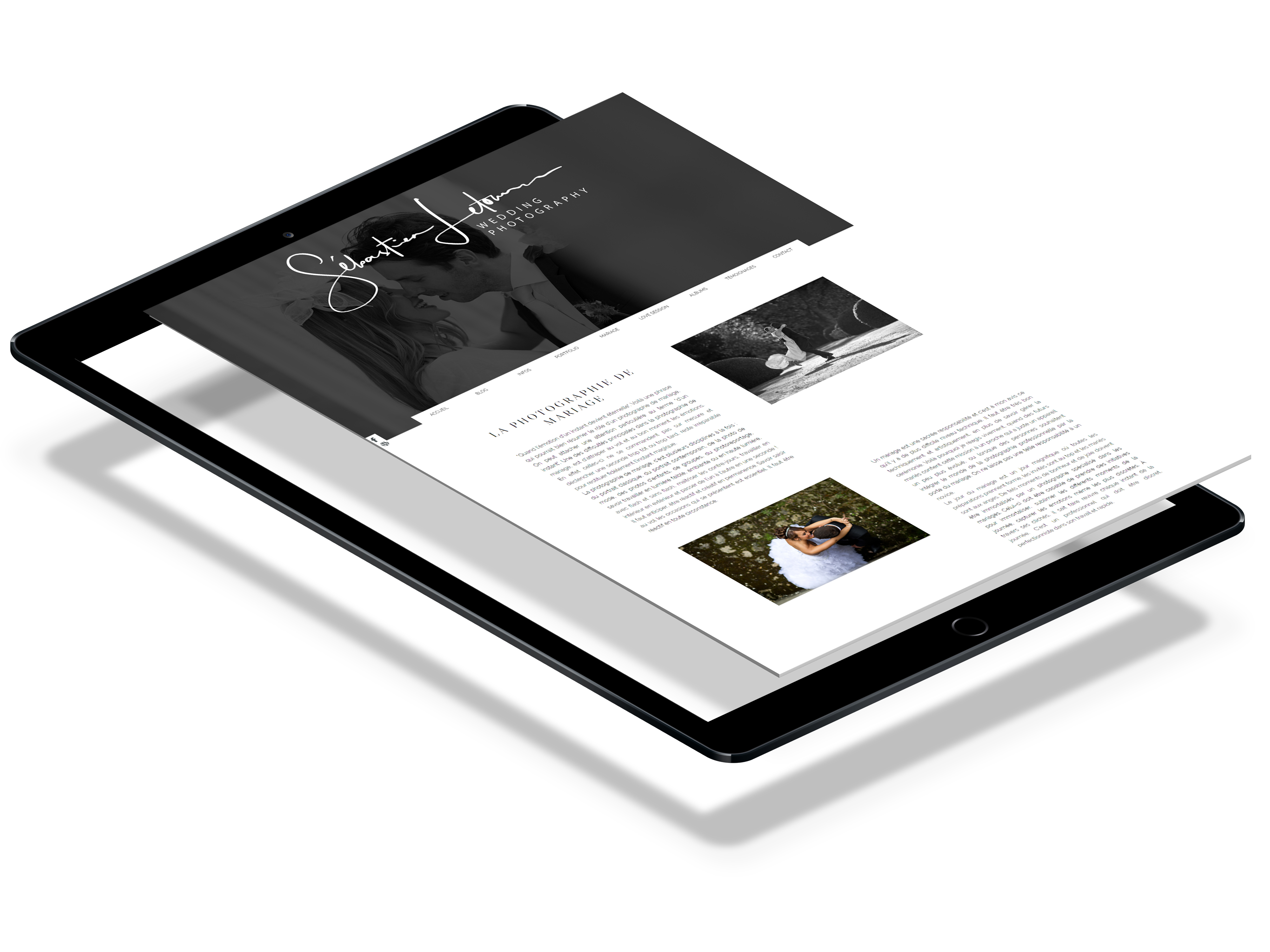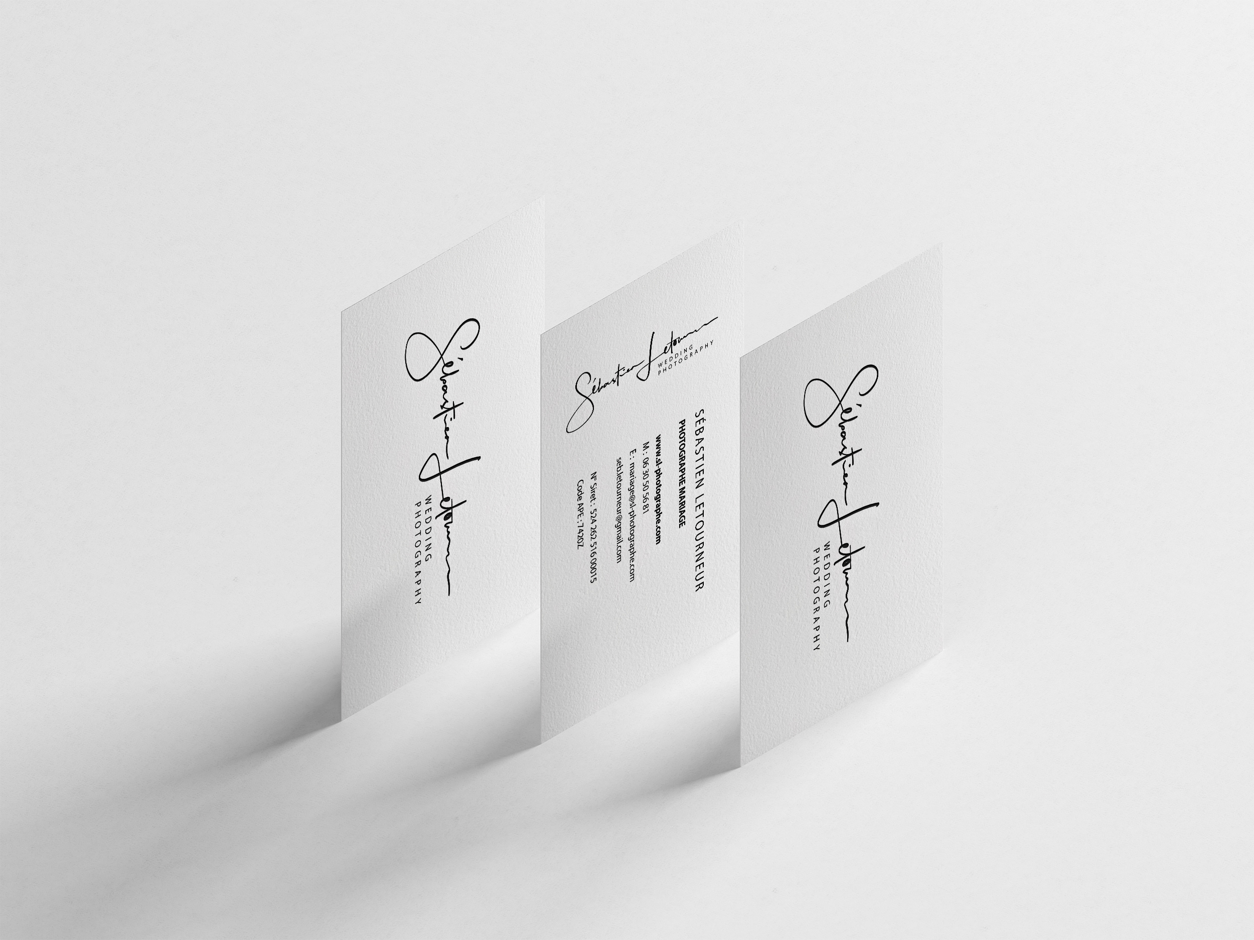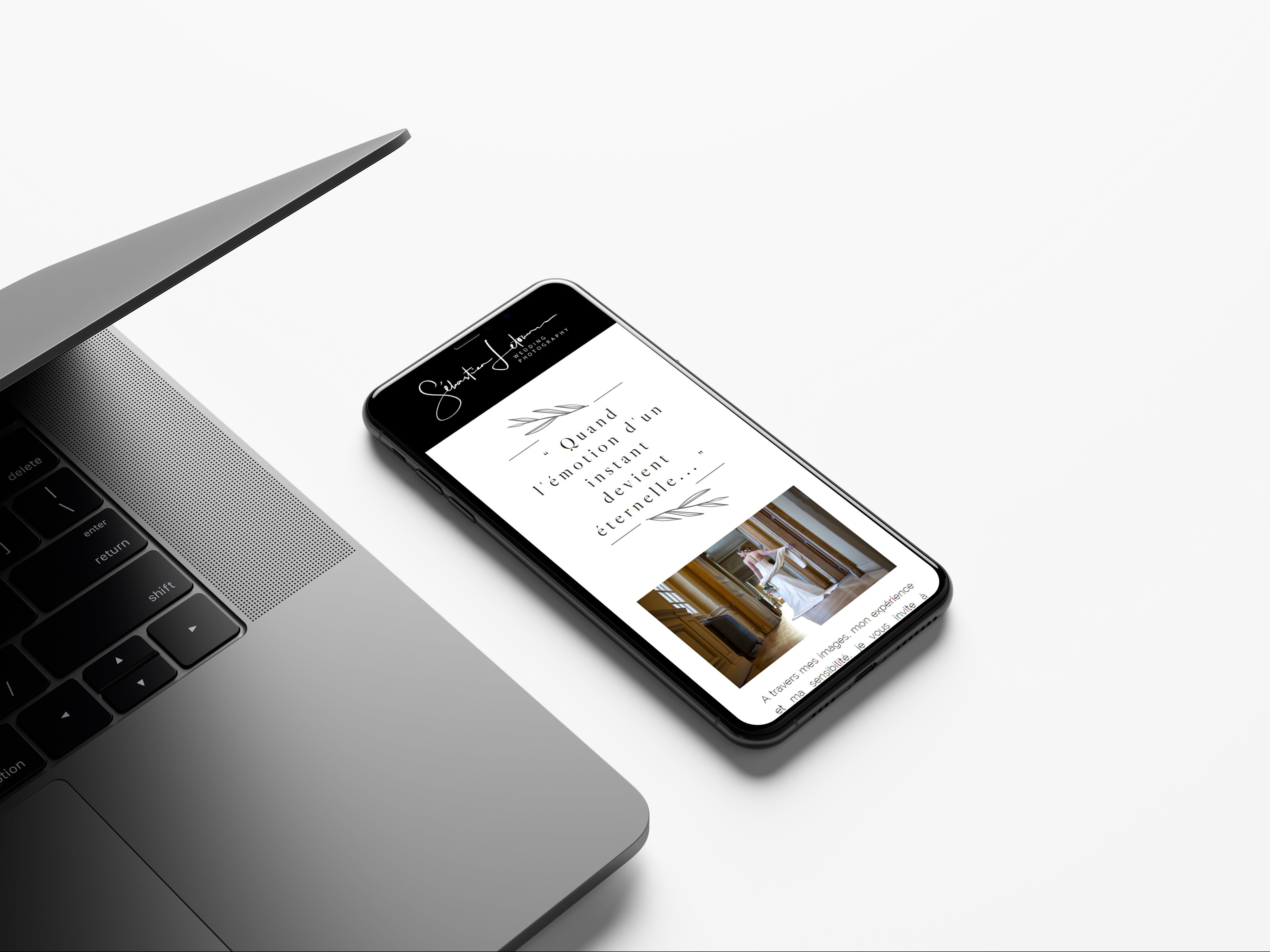 Refont from scratch d'un site web responsive pour un photographe de mariage. Créations vectorielles, impressions de cartes de visite et contrats.